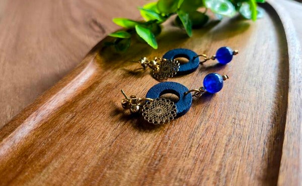 Eleganta-Ohrringe aus holz facettierter Blaue Glas kugel mit Boho Ohrstecer Handarbeit Unikat Desig