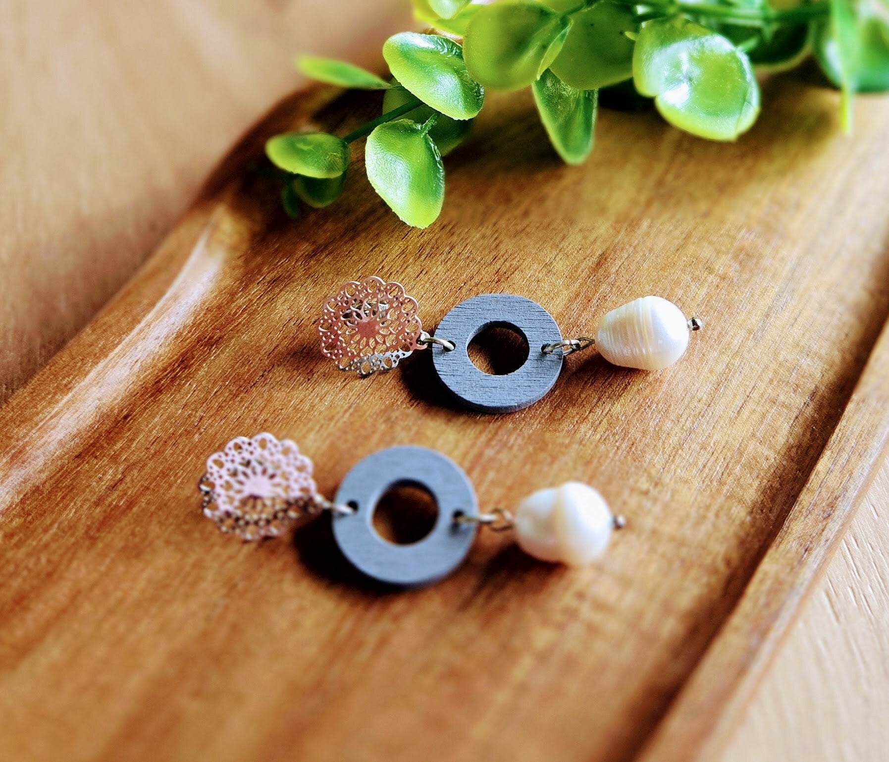 Holz Ohrringe mit Süsswaserperlen und Edelsthal