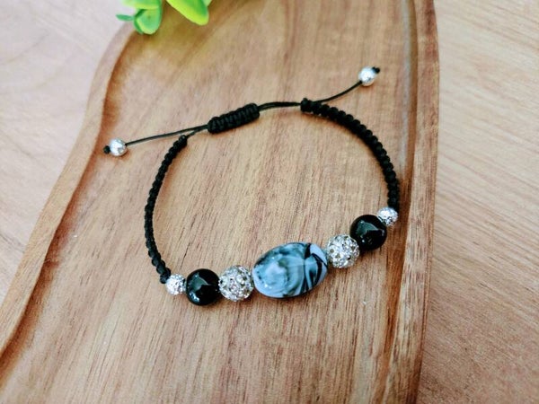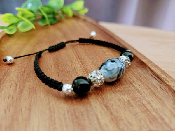 Makramee Armband 8mm gross Edelstein mit Kunstoff und Metall Zwischenperlen